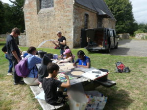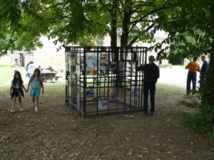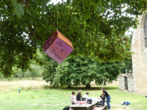 Cette année, une rencontre avec le plasticien Benoît Delomez et une inspiration collective sur le thème du cube. L’installation est restée tout l’été à la Maison du Parc de Carrouges.